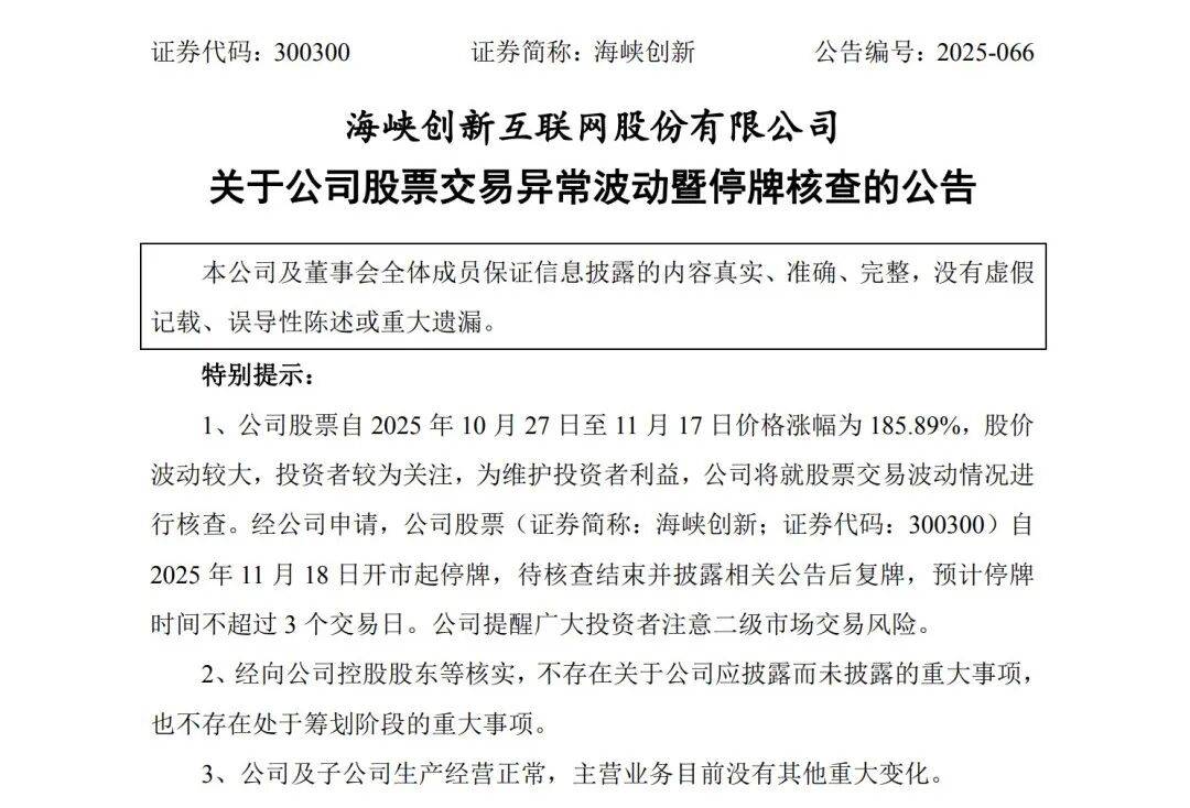 同日,海峡立异通知布告称,公司股票自10月27日至11月17日价钱涨幅为185。89%,为投资者好处,公司迁就股票买卖波动环境进行核查。经公司申请,公司股票自2025年11月18日开市起停牌,待核查竣事并披露相关通知布告后复牌,估计停牌时间不跨越3个买卖日。公司目前运营环境一般,表里部运营未发生严沉变化,前期披露的消息不存正在需要更正、弥补之处。