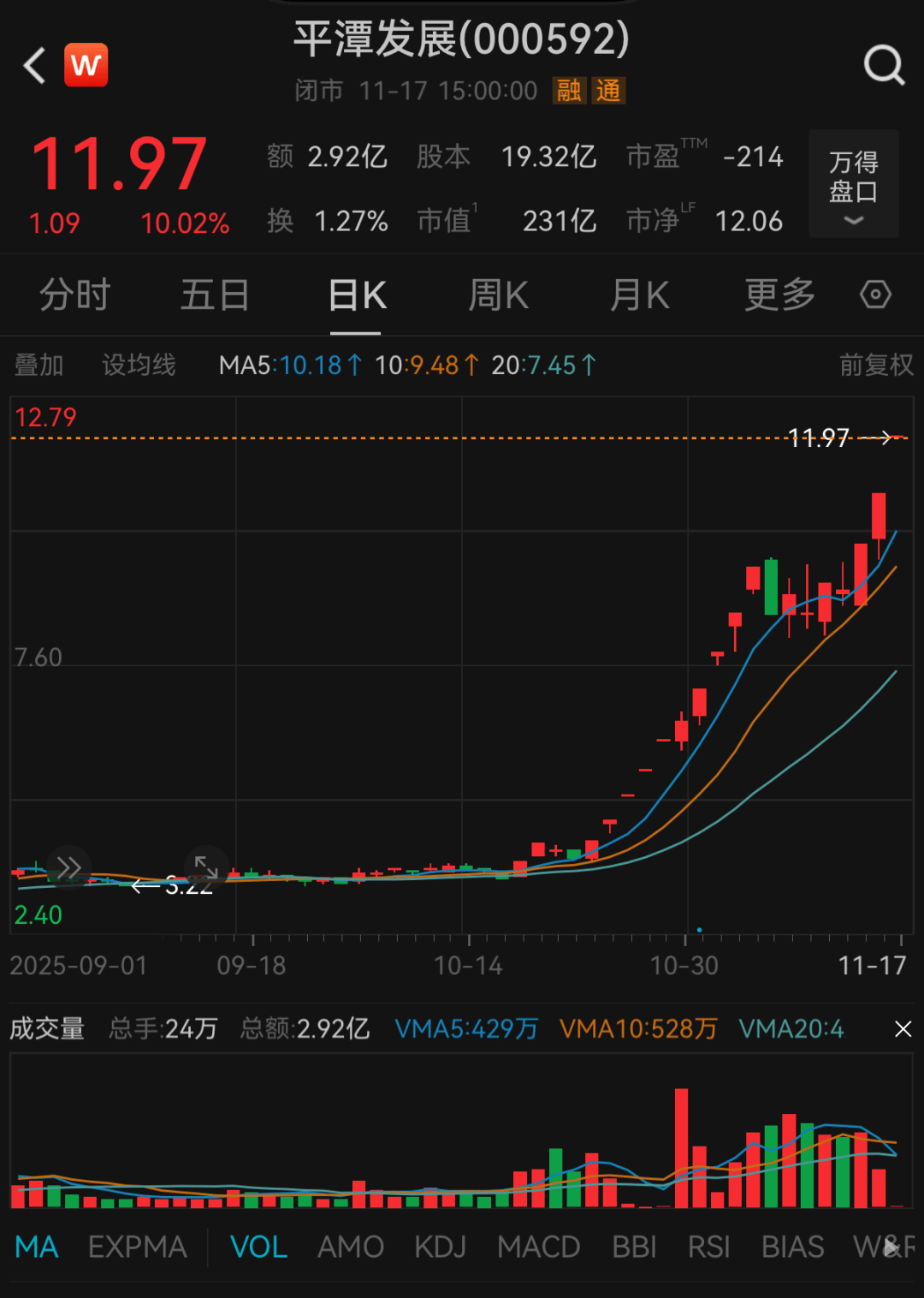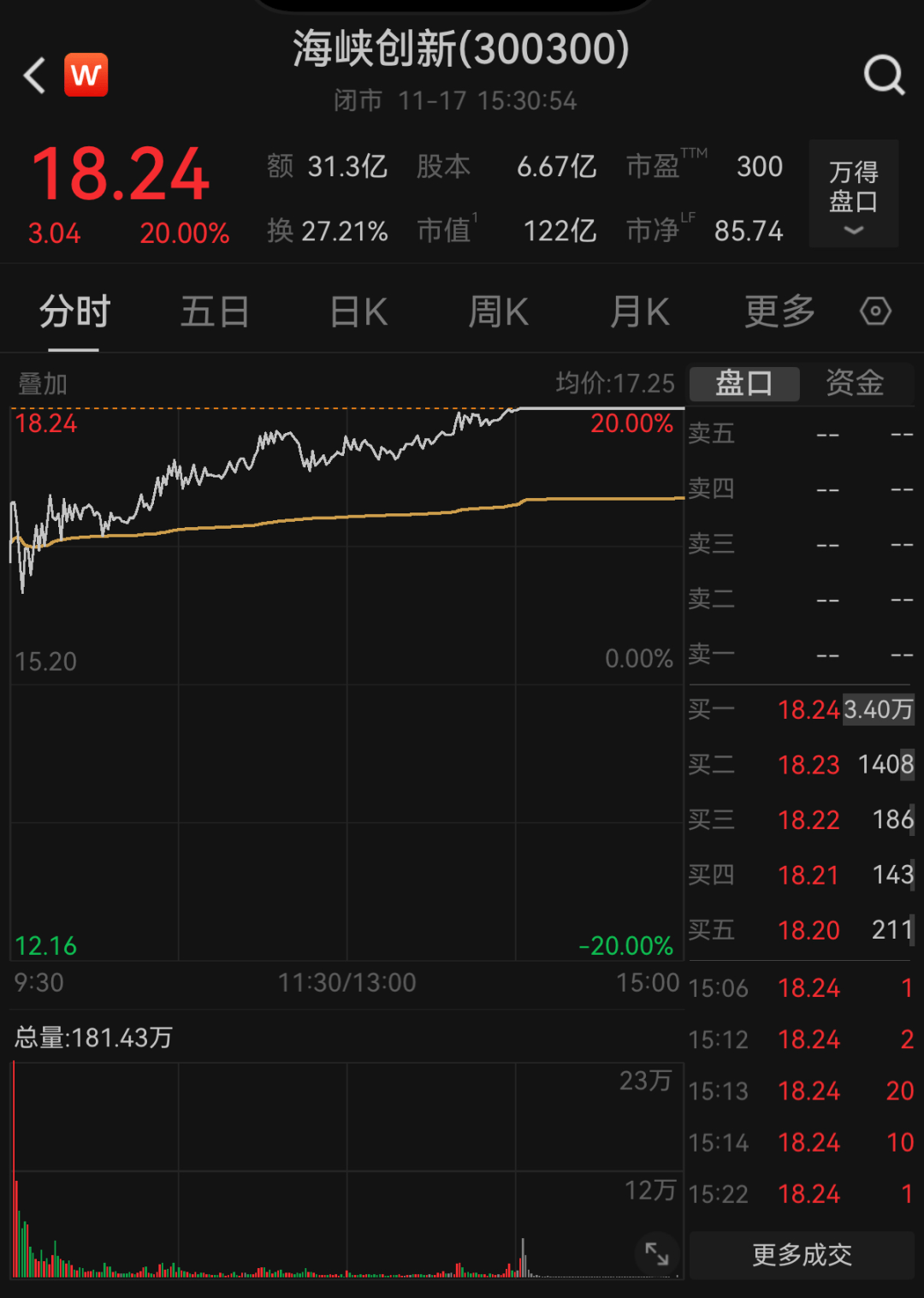 截至11月17日收盘,平潭成长报11。97元/股,涨幅为10。02%,总市值为231亿元;海峡立异报18。24元/股,涨幅为20。00%,总市值为122亿元。