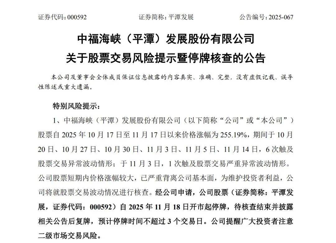 平潭成长晚间通知布告显示,公司股票自2025年10月17日至11月17日以来价钱涨幅为255。19%,期间6次触及股票买卖非常波动景象,1次触及股票买卖严沉非常波动景象。公司股票短期内价钱涨幅较大,已严沉公司根基面,为投资者好处,公司迁就股票买卖波动环境进行核查。经公司申请,公司股票自2025年11月18日开市起停牌,待核查竣事并披露相关通知布告后复牌,估计停牌时间不跨越3个买卖日。平潭成长称,公司从停业务未发生严沉变化,股价短期内持续上涨,存正在市场情感过热、非炒做风险。