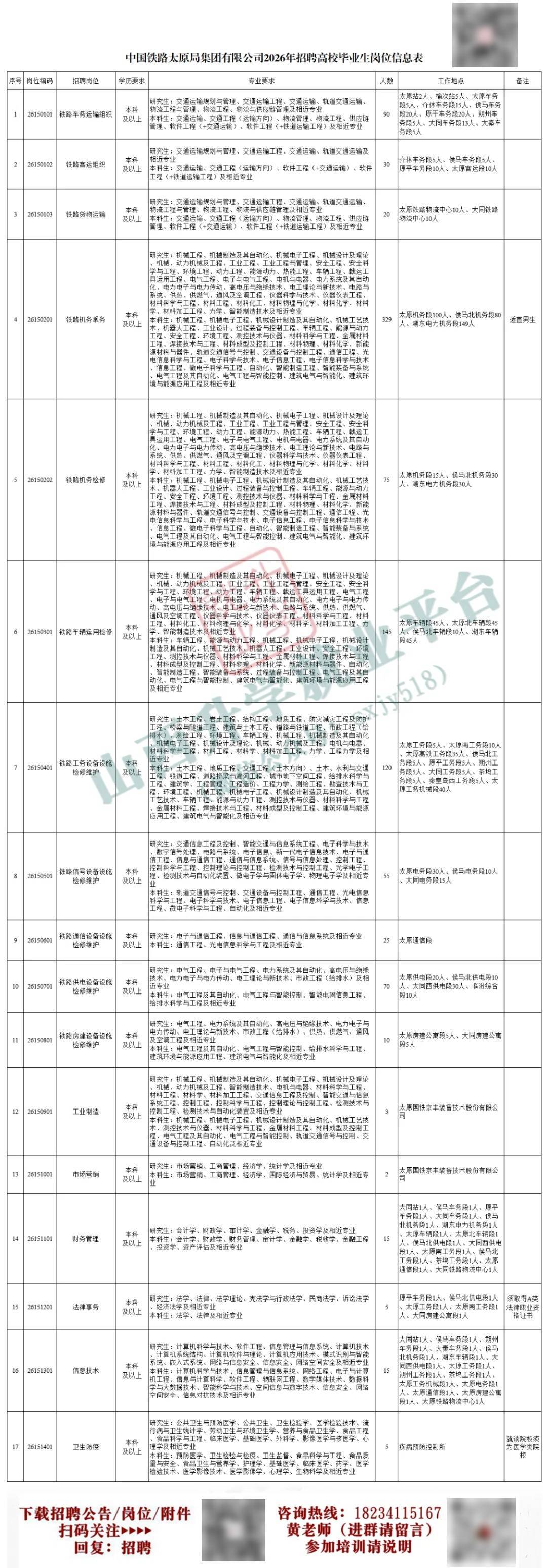 中国铁太原局集团无限公司按照企业成长需要,现将2026年全日制通俗高档职业院校高职(大专)结业生聘请相关事项通知布告如下:(二)2026年结业,列入国度招生打算,按期取得结业证的全日制通俗高档院校高职(大专)学历结业生;合适国度政策要求的离校未就业结业生以应届结业生身份加入招聘。(三)就读院校生源及讲授质量较好,须开设有铁特色专业,所学专业为铁专业标的目的,所学课程为铁从专业课程。(四)须合适聘请岗亭要求的学历、专业等前提,辨色力一般、双眼矫无视力不低于5。0,具备优良的身体前提和心理本质;顺应持久正在铁沿线、偏僻山区、艰辛地域工做及户外、野外、轮班、夜班功课要求,从命我公司对岗亭的放置和调整。(一)简历送达。登录“太铁聘请”(https!//)注册,按照“简历送达须知”要求实正在、精确填写根基消息,将所要求的求职材料清晰扫描,压缩正在一个完整压缩包内,上传。简历送达每人限选一个岗亭,消息填报、点窜共三次机遇,锁定后无法点窜。简历送达完成后,请及时正在“太铁聘请”下载打印《高档院校结业生聘请申请表》。本次聘请仅接管招聘结业生本人通过“太铁聘请”平台送达简历,不接管其他体例报名。(二)资历审查。我公司将按照岗亭需求、学历、专业、生源前提、岗亭适配度等要素,分期分批进行资历审查,择优筛选合适岗亭要求的结业生加入后续聘请环节。(三)测验查核。按照资历审查环境,分期分批进行测验查核,同步进行求职材料等沉点项目现场审核和确认,具体时间、地址及体例另行通知。(四)公示录用。对招聘人员相关环境进行复审,分析测验查核等环境,构成拟录用人选。通过“中国铁人才聘请网”和“太铁聘请”对拟录用人员进行公示。公示期满无的,打点录用手续。(三)招聘人员应按要求加入聘请勾当,因通信不畅等缘由导致未按要求加入或耽搁的视为放弃。对未进入下一聘请环节的,不再进行零丁通知,敬请谅解。(四)资历审查、诚信审查等贯穿聘请录用全过程。招聘人员应盲目恪守聘请规律、聘请次序,秉承诚笃取信准绳,对根基消息、简历内容、测验查核的实正在性、无效性、精确性和完整性担任。如发觉存正在伪制抄袭、藏匿虚假、违反聘请规律、聘请次序、颁发不实消息等行为,打消招聘、录用资历。(五)中国铁太原局集团无限公司不向招聘者收取任何费用,不指定用书,不举办也不委托任何机构或小我举办任何形式的培训班,请提高,谨防冒名诈骗。